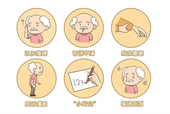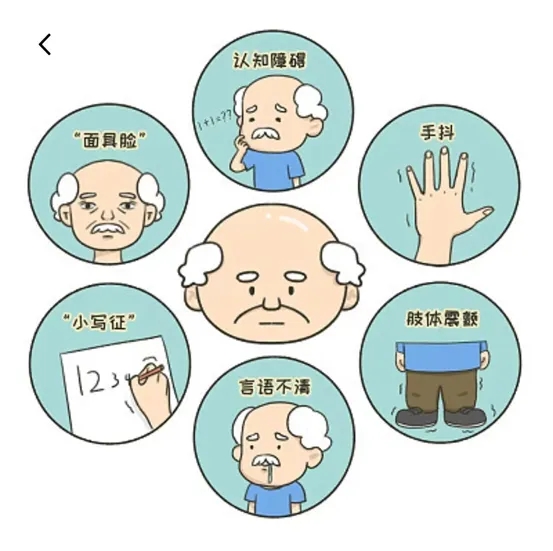 动作迟缓:随意运动减少,动作缓慢;面部肌肉运动减少,双目凝视,眨眼减少表情呆滞,酷似为“面具脸”;语速变慢,写字字体越写越小。