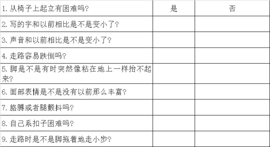 我们可以通过下面的帕金森病调查问卷初步进行自我筛查。这个问卷包括9个问题,如果我们出现了问卷中所描述的症状,就在后面选择“是”,如果没有出现,那就选择“否”。