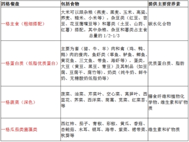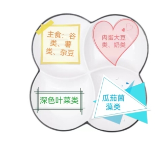 四格餐盘法:其中一格为谷薯类、一格为低脂优质蛋白质、一格为深色蔬菜、一格为茄果类菌藻类的蔬菜。这样可以做到食物种类多样化,营养更均衡。