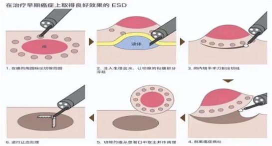 ESD是将内镜顺着消化道直达病变位置,在黏膜下注射基础上利用几种特殊的高频电刀将病变所在黏膜剥离,从而达到治疗目的。