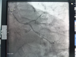 入住我院心血管内科后,医生们做了全面细致的术前评估,并于3月1日为其做了冠脉造影术。检查结果显示:左前降支近段最严重狭窄90%,第一对角支最严重狭窄95%,回旋支中段闭塞,右冠近段最严重狭窄80%。结合患者症状及心电图表现,决定先处理回旋支病变。