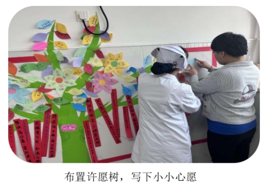 护士和患者共同参与,用折纸布置工娱疗室,并在病房一角布置许愿树,每一张许愿牌都有一个故事,每一份红纸条都承载着一份思念与期待。