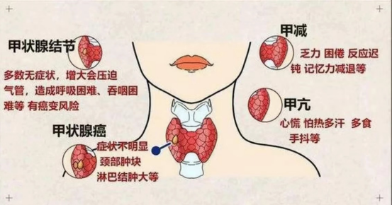l甲状腺炎:常见的甲状腺炎有桥本氏甲状腺炎和亚急性甲状腺炎两种。桥本氏甲状腺炎是一种自身免疫性疾病,是导致甲状腺功能减退,诱发甲亢或甲减的重要原因;亚急性甲状腺炎由病毒感染所致,是以甲状腺功能变化为特征的局部炎症,通常有颈部疼痛、弥漫性甲状腺肿伴压痛等表现。