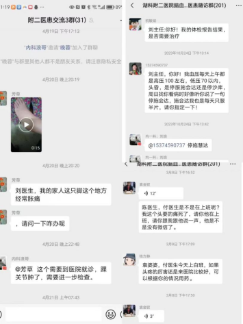 科内建有3个微信群,为在院、出院患者提供24小时在线咨询服务,患者有任何医疗、护理上的问题可以随时在群里进行咨询,医生和护士会及时给予专业性的答复,避免患者来回奔走,降低患者的经济负担和时间成本。