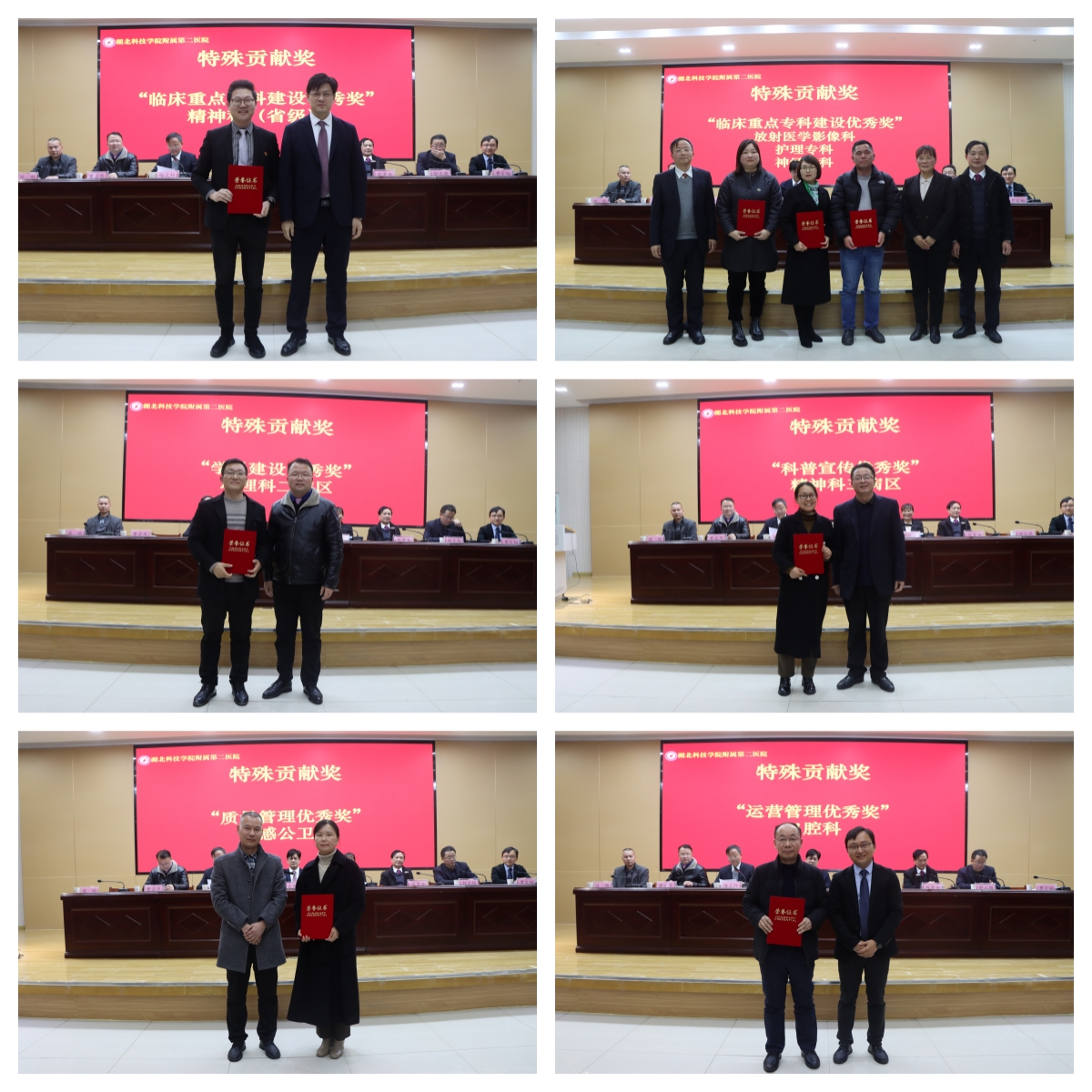 大会后半程,召开2023年度表彰大会。梅武轩宣读2023年先进集体及个人表彰名单。本次表彰首次设立“临床重点专科建设优秀奖”、“学科建设优秀奖”、“科普宣传优秀奖”、“质控管理优秀奖”、“运营管理优秀奖”等五项特殊贡献奖,精神科、放射医学影像科、护理专科、神经内科、心理科二病区、精神科三病区、院感公卫办、口腔科获奖。