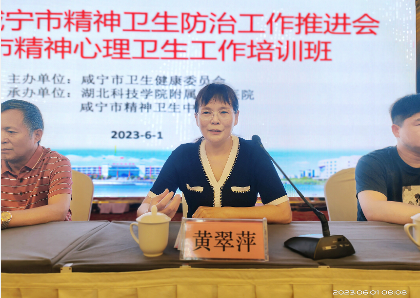 市卫健委副主任钟平、医院院长黄翠萍教授出席开幕式并致辞,副院长曹文韬主持开幕式。咸宁市各县(市区)卫健局、疾控中心相关负责人及全市医疗卫生机构从事精神心理卫生医护200余人参加培训。