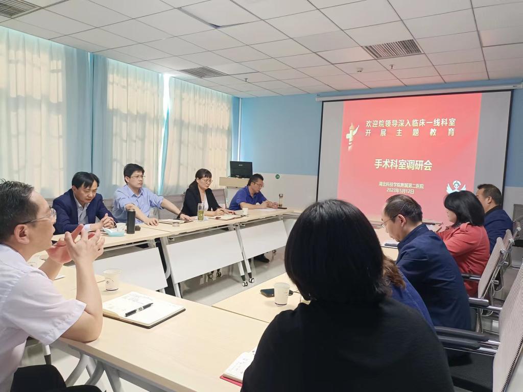 (通讯员 程仁杰)为深入学习贯彻习近平新时代中国特色社会主义思想主题教育总要求,大兴调查研究,着力解决临床科室实际问题,促进医院高质量发展,5月9日、12日,党委书记查文良、院长黄翠萍带队分两次深入临床科室开展主题教育调查研究。党委副书记兼副院长陈克全、副院长赵正据、副院长陈明和相关职能部门负责人参加调研。