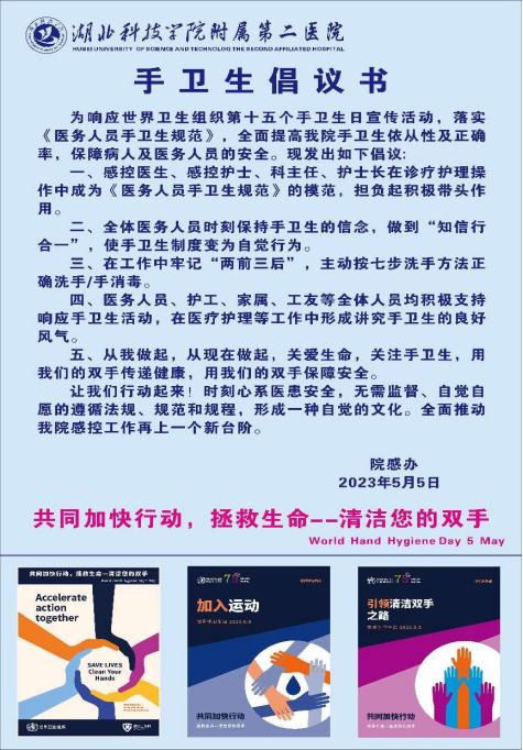 2023年5月5日,是第15个“世界手卫生日”,为进一步提升医务人员感染防控意识,提高群众预防疾病意识,增强医、护、患手卫生的依从性和正确性,更好地营造良好的医院手卫生环境,5月5日,我院开展了以“共同加快行动,拯救生命——清洁您的双手”为主题的手卫生系列宣教活动。