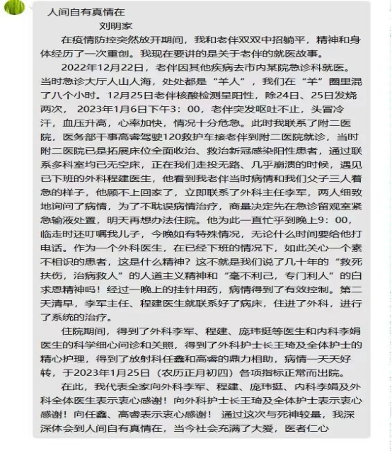 辞旧迎新,医路同行。“在疫情防控突然放开期间,我和老伴双双中招躺平,精神和身体经历了一次重创……住院期间,得到了外科李军、程建等医生的精心治疗和关照,以及内二科李娟医生科学细心的研判指导,得到了外科护士长王琦及护理团队的精心照护,得到了放射科任鑫和高睿的鼎力相助,病情一天天好转,于1月25日(农历正月初四)各项指标正常而出院……”