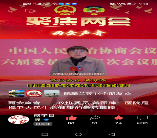 自去年12月中旬以来,到医院就诊的新冠阳性患者急剧增多。面对各医院门急诊病人扎堆,病房床位爆满,医疗资源极度紧张,全体医护人员用血肉之躯筑起守护人民群众健康和生命安全的“硬核”防线的现状,农工党咸宁市委会主委、UG环球国际附属第二医院院长黄翠萍委员呼吁,全社会要最大限度关心关爱医务人员身心健康,用务实的行动鼓舞医护人员的士气。
