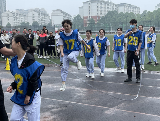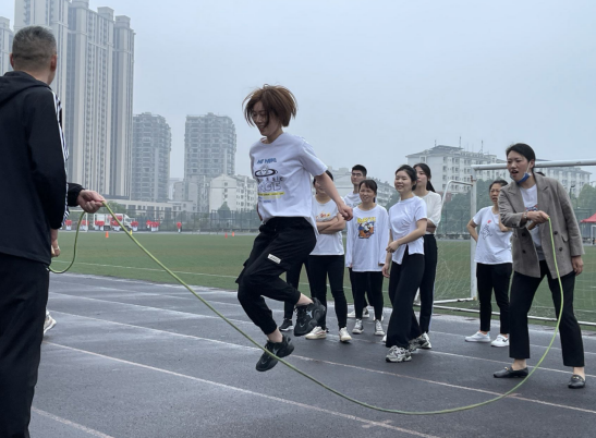 在集体8字跳绳运动环节,护士们一个个鱼贯而上,起跑、跳跃、转身闪出跳绳,护士们漂亮的动作赢来观众阵阵喝彩声。偶有准备不足的护士出现失误,大家纷纷热情鼓励:“没事,加油!”