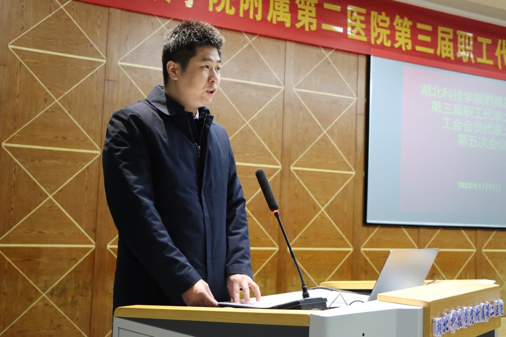 张欢作了题为《勠力同心 接续奋斗 积极主动服务医院高质量发展》的工会工作报告,报告总结了过去一年工会工作、群团工作的成绩与不足,明确了明年主要任务和目标。