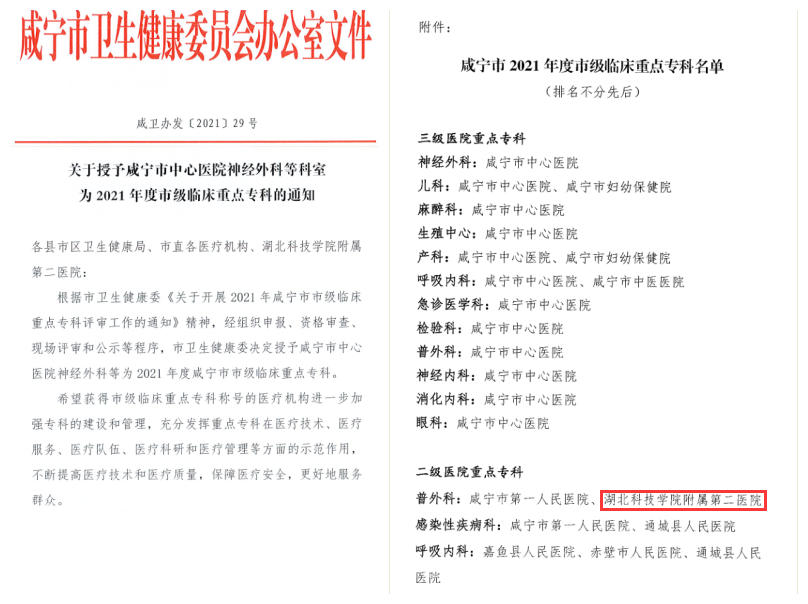 12月15日,从咸宁市卫健委传来好消息,我院普外科被授予2021年度市级临床重点专科,标志着医院普通外科技术水平和服务能力再上新台阶。