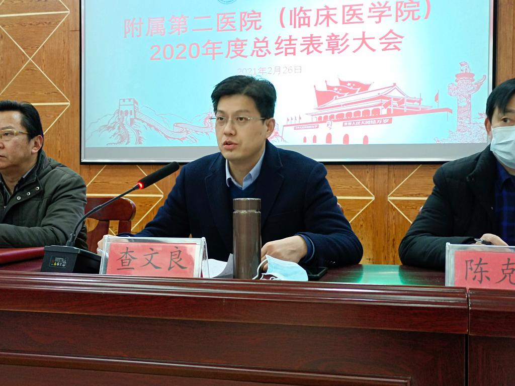 查文良作2020年度医院工作总结。他指出,2020年附属二医院(临床医学院)在学校党委的正确领导下,全院干部职工齐心协力、共克时艰,于危机中育先机,为咸宁市抗疫取得重大阶段性成果作出了突出贡献,医院党建、抗疫、教学、科研、医疗等各方面都取得了可喜成绩,进一步凝聚了人心、振奋了精神,扩大了医院声誉。