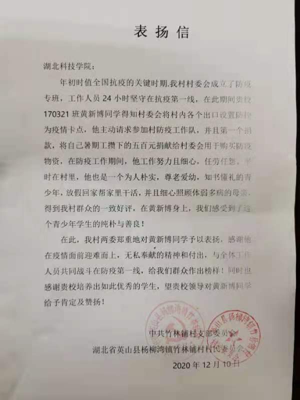 表扬信中说,去年年初,全国疫情严峻,英山县杨柳湾镇竹林铺村委会成立防疫专班,工作人员24小时坚守在抗疫第一线,黄新博同学得知村委会将村内各个出口设置防控疫情卡点,他主动请求参加村防疫工作队,并且第一个捐款,将自己暑期工攒下的五百元捐献给村委会用于购买防疫物资,在防疫工作的二个多月期间,他工作努力细心,任劳任怨。平时在村里,他也是一个为人朴实,尊老爱幼,知书懂礼的青少年,放假回家帮家里干活,细心照顾体弱多病的母亲,受到村民一致好评。在黄新博身上,我们感受到了这个青少年学生的纯朴与善良!我村两委郑重地对黄新博同学予以表扬,感谢他在疫情面前迎难而上,无私奉献,与全体工作人员共同战斗在防疫第一线,给我们群众作出榜样!