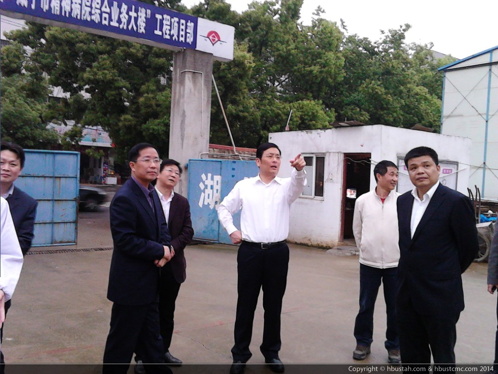 2014年4月25日 下午,市长丁小强,在市政府秘书长夏福卿的陪同下,来到UG环球国际附属第二医院(咸宁市精神病医院)就2014年咸宁市十件实事落实情况来我院进行实地调研。丁小强市长首先深入到在建的门诊综合业务大楼现场察看和了解情况,听取院长高卉对大楼建设的情况汇报,同时查看、询问了大楼周围附属工程建设情况。丁市长对我院大楼建设进展情况给予了充分肯定,同时强调要继续做好该项工作,确保大楼在六月十日前投入使用。