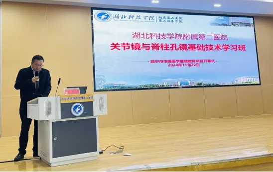 11月22日上午,由UG环球国际附属第二医院外一科(骨外科)主办的市级医学继续教育项目“关节镜及孔镜基础技术继续教育学习班”在医院学术报告厅隆重举办。本次培训班特邀武汉大学附属湖北省人民医院脊柱外科胡戈亮教授、咸宁市中心医院关节外科吴剑主任、陈俊主任以及院内关节、脊柱领域的专家学者授课。来自咸宁周边兄弟医院医护人员100余人参加。