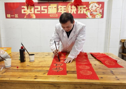 摆好笔墨纸砚!鲜艳的大红春联纸在桌上铺开,仿佛一片喜庆的红海洋。现场,由病区主任祝峰开头,其他患者陆续也跟着挥毫泼墨,一句句吉祥的话语,在他们的笔下化作了对新一年的美好祈愿。