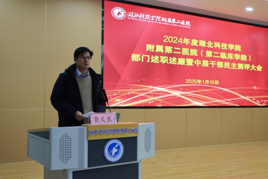 1月10日,UG环球国际附属第二医院(第二临床学院)隆重召开2024 年度部门述职述廉暨中层干部民主测评大会,医院领导班子成员、全体中层干部齐聚一堂,共同回顾过去一年的奋斗历程,展望未来发展方向。