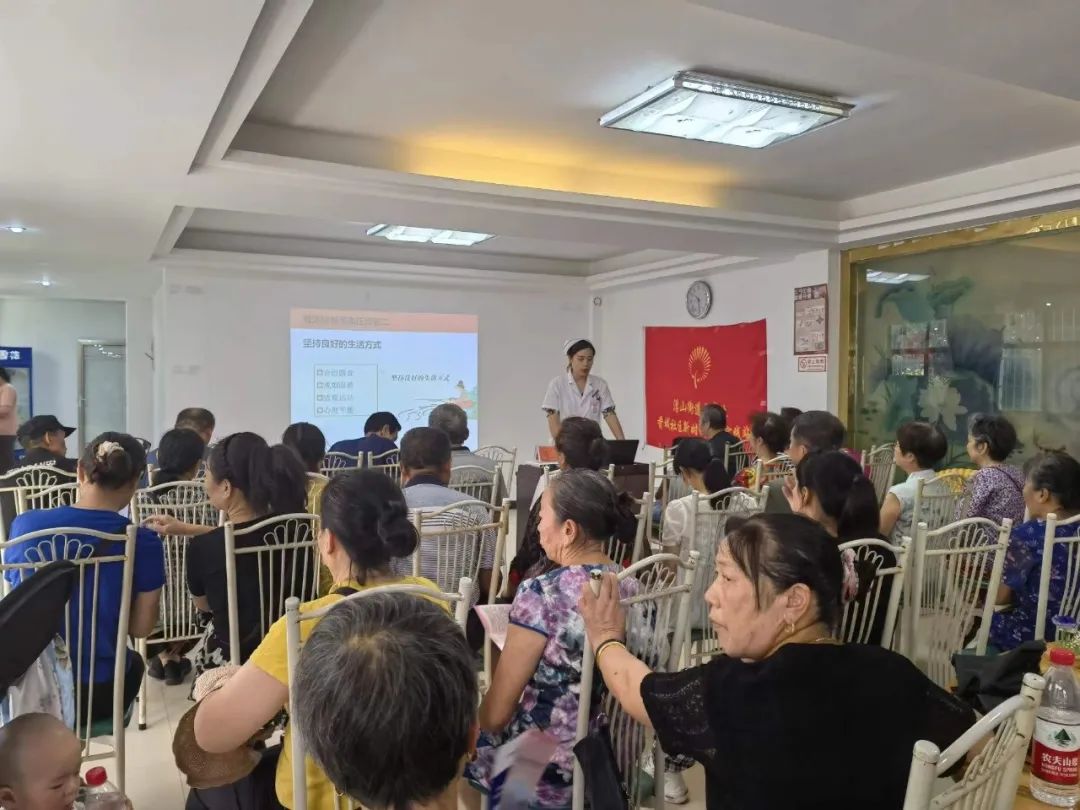 义诊过后,该院内一科护士长黄娟给老人们介绍了高血压的诊断标准及分类、危险因素、健康管理、防治及防治误区等,并为大家现场答疑。此次宣讲提高了群众对高血压及其危险因素的认识和自我保健能力,帮助大家自觉养成良好的健康行为和生活方式。宣教现场,医护人员还给大家发放了高血压健康宣传手册。讲座生动具体、通俗易懂,得到社区居民的一致好评。