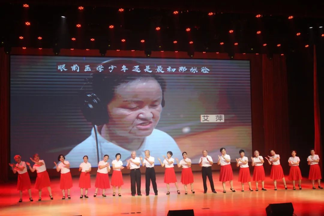 在第三篇章逐梦中,通过知名校友寄语视频与一群平均年龄70岁的湖科退休教职工唱响《医学部·少年》相结合,体现一代代湖科人在党的领导下赓续红色血脉,践行初心使命、前仆后继、“医”心向党、接续奋斗,谱写湖科医学教育奋进凯歌的故事。当一面巨幅五星红旗从观众席上冉冉升起向舞台飘去,全场观众立即起立,共同高唱《没有共产党就没有新中国》。刹那间,激昂的歌声和经久不息热烈掌声将整场演出推向高潮。