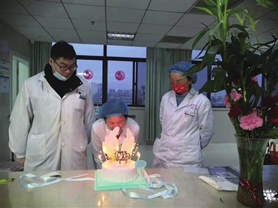 上图:大年初三,护士周红英值年班,恰好她生日,科室为其订了蛋糕,由于换药的患者众多,直到当日下午五点,这个蛋糕才被切开。