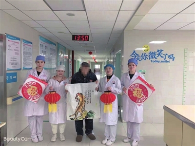上图:这是患者王爷爷在该院过的第10个年,今年是虎年,为了感谢医护人员对他的照顾,王爷爷特意画了一幅虎年画像送给他们。