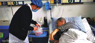 上图:黄爷爷是一个慢阻肺病人,因疾病需要持续吸氧,春节也没回家过年。过年期间,医院值班护士每天来上班时都会给黄爷爷带来早餐。