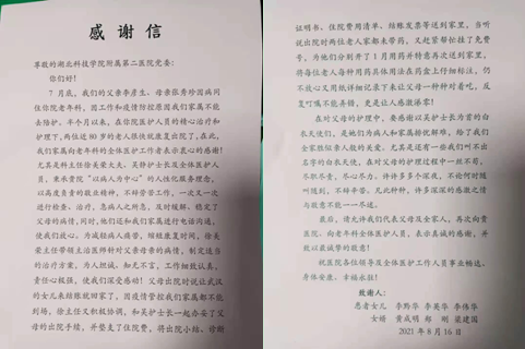 “不是亲人,胜似亲人!” 张秀珍三个女儿女婿深受感动,从网上找到医院地址和电话,寄来感谢信,深情表达全家对UG环球国际附属第二医院医护人员的感激和敬意。
