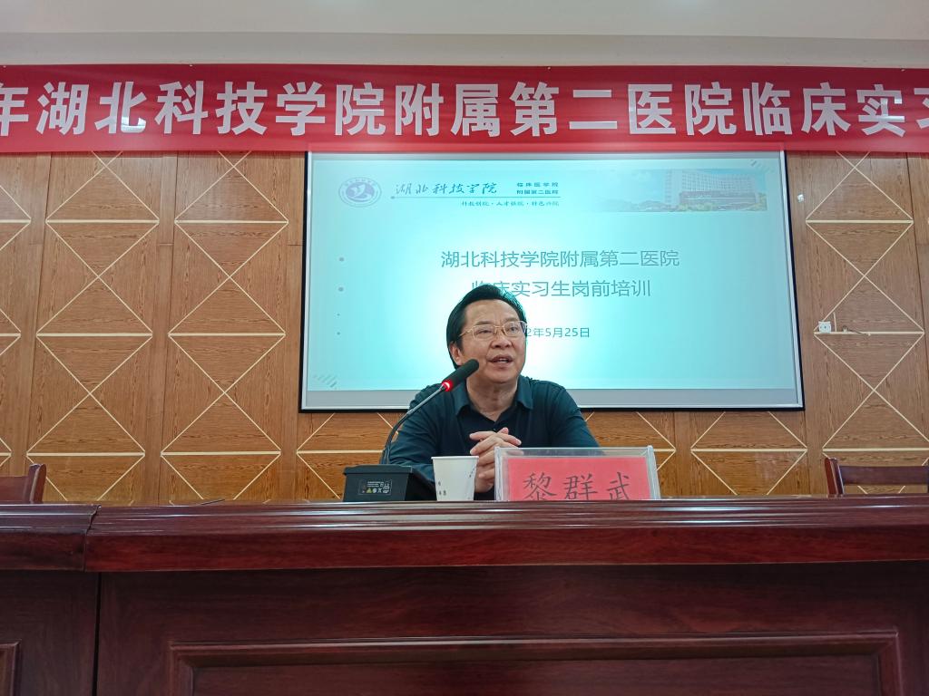 本次实习生岗前培训工作得到了院领导的高度重视和职能科室的大力支持。院党委书记黎群武同志出席培训班并致辞,对同学们的到来表示热烈的欢迎,并对临床实习之路指引了方向,同时提出殷切的希望。黎群武书记指出:临床实习工作是医学教育过程中的一个至关重要的环节,是学校教育的延伸,是专业理论与实践相结合的关键所在。他要求各位同学在实习期间首先要树立明确的目标,只有树立了明确的目标才会有自己努力的方向和依据;其二要端正学习态度,严格要求自己,坚持求真务实的学习理念;其三要有持续的行动力,唯有行动起来,成功才会如期而至。他强调只有把握了以上三点才会更好更快地实现理论知识学习和临床实践的转变,圆满完成实习任务,争取早日成为适应社会发展的新一代医学人。