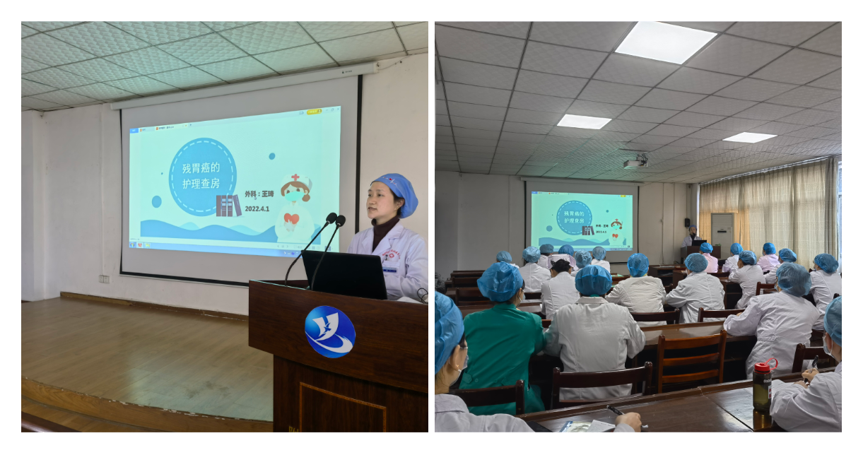 本次护理查房主要针对一例残胃癌病例进行了汇报。外科护士长王琦向大家介绍患者的基本情况及体征,简要病史,阐述该病人的护理诊断、护理目的、护理措施及健康问题。内科副护士长邱琴从专科角度,对这次护理业务查房中的护理难点,从5个方面提出切实可行的意见和建议;中医康复科护士长徐燕针对病人可能发生的护理问题提出了指导性的意见,应提高护理人员专科知识的认识度;精神科男病区护士长程文涛提出,经过此次查房后收获颇多,对肿瘤病人的护理有了新的认识,对以后收治此类病人有指导作用。现场讨论氛围热烈,护理人员各抒己见,就患者现存的护理难点进行了积极的探讨。