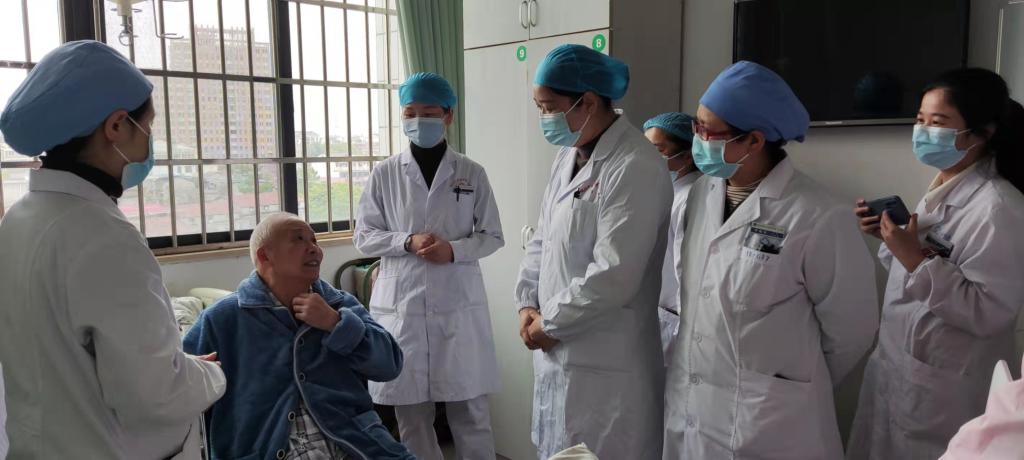 汇报完毕后,护理部负责人唐春花带领各科护士长进入患者所在的病房进行护理查体,更深入地了解患者的现有症状及恢复程度。查体结束,唐春花针对查体结果,提出几个患者现存及潜在的护理问题,科室护士都做了相应的解答。