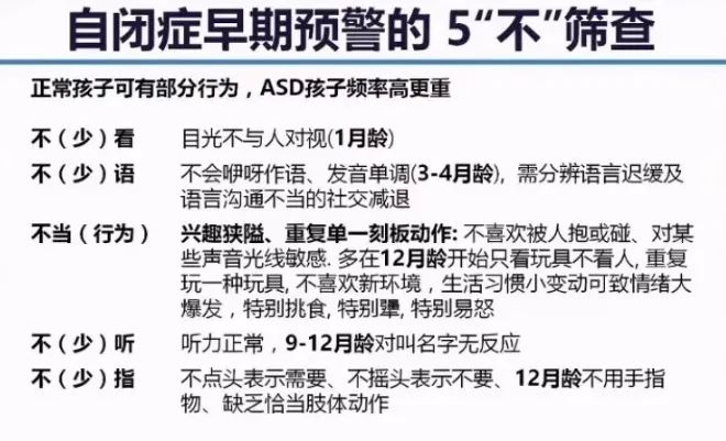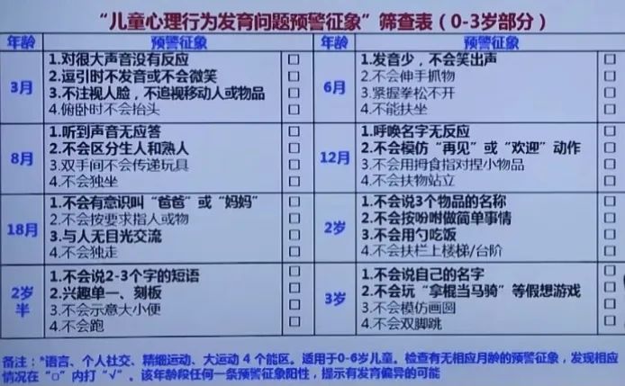 孤独症患儿在两岁前就会出现症状。儿童心理行为发育问题预警征象筛查表中,明确列举了不同年龄儿童中孤独症的预警表现,也提示家长尽早发现孩子孤独症的问题(表中标粗的地方尤其注意)。